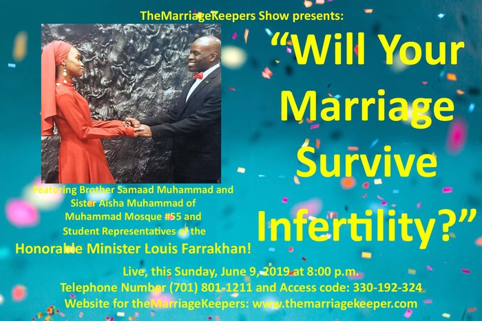 www.facebook.com/events/1592307724244177 God willing, this Sunday, June 9, 2019, at 8:00 p.m. EST., please join theMarriageKeepers as we welcome, Brother Samaad Muhammad and his lovely wife, Sister Aisha Muhammad of Muhamad Mosque #55. They are both Student Representatives of the Honorable Minister Louis Farrakhan on the show! Theye are going to discuss with us, “Will your Marriage Survive Infertility?"